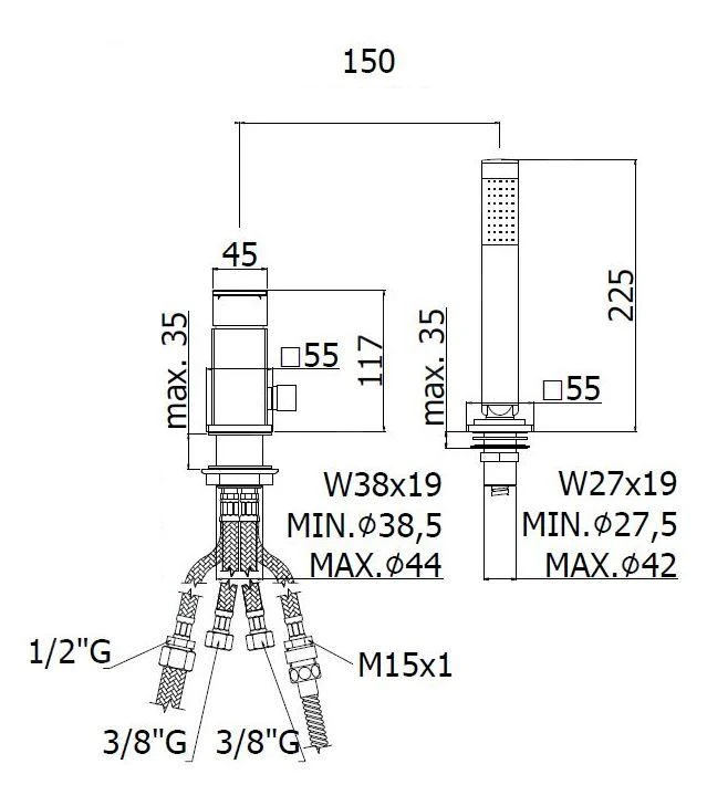 - hoogte staafdouche 225 mm